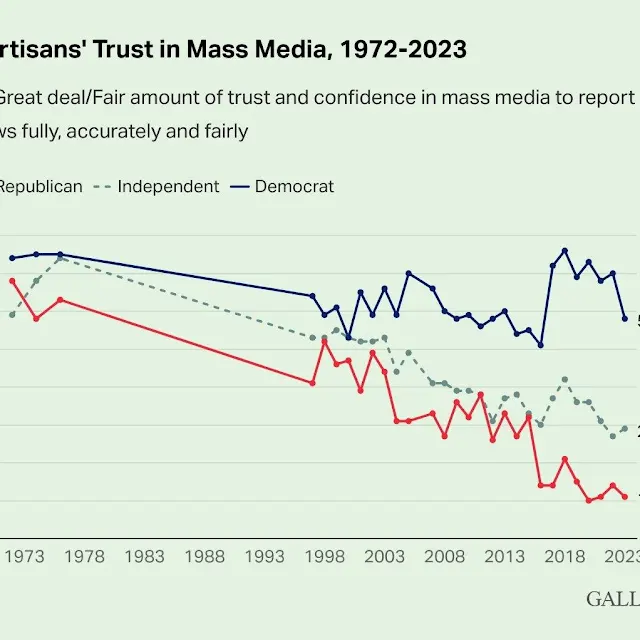 I'm sorry but if your lightning rod for Truth telling is Donald Trump, you are plugged into the fucking Matrix, the man is easily fact checked and I think it makes sense that Republicans abandon mass media when trump starts campaigning in 2015 and Democrats' trust spikes once the Trump presidency begins and news coverage becomes 90% Trump making claims and Trump claims being fact checked.