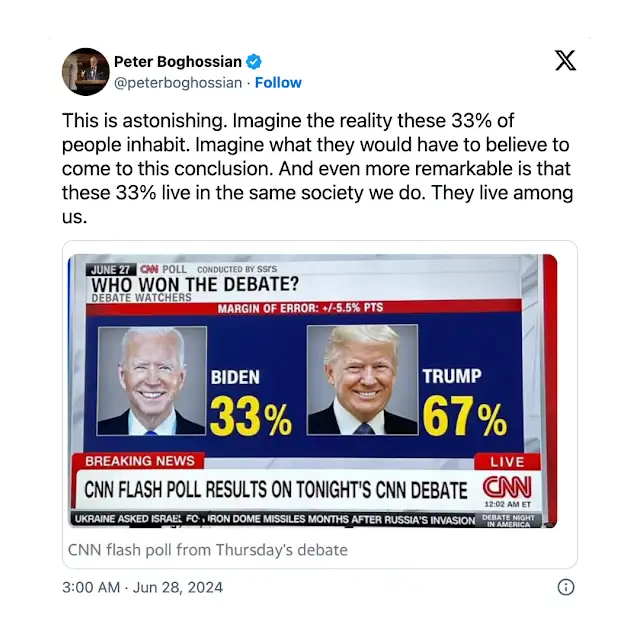 What I was curious to see, was whether Peter would make the same point about the Harris-Trump debate. The CNN flash poll shows a similar disparity as has almost all commentary I have heard. Again it's not astonishing to me at this point that there are people who will think Trump won a debate if he simply manages to stay alive until the end of it. But Peter should have been astonished that 37% of the CNN polled audience live in a reality where Trump did better than Kamala in the debate.